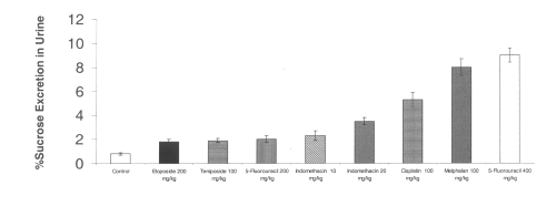 All of the chemotherapeutic agents tested increased gastroduodenal permeability as measured by sucrose excretion from baseline controls. The sucrose excretion in urine also appears to be dose-dependent for 5-fluorouracilbetween 200 and 400 mg/kg. The NSAID indomethacin at doses of 10-20 mg/kg significantly increased gastrodudenal permeability as measured by sucrose excretion in urine. (Figure 1)