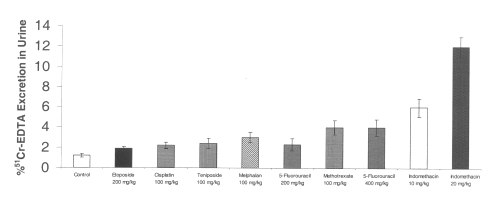 Figure 2: Urinary excretion of 51Cr-EDTA after administration of single doses of indomethacin and chemotherapeutic agents to rats. (N=5, Mean+/- SEM).