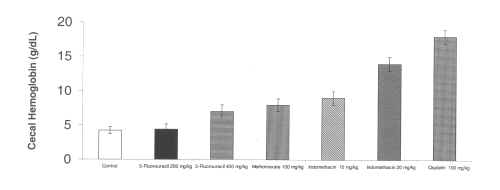 All of the chemotherapeutic agents tested also increased cecal hemoglobin from baseline controls. Indomethacin at a dose of 10 mg/kg significantly increased gastrointestinal bleeding as measured by cecal hemoglobin. (Figure 3)