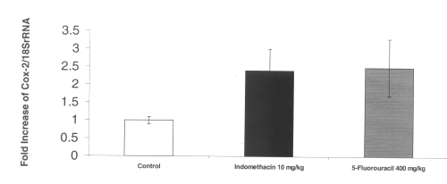 The RT-PCR of COX-2 mRNA in intestinal tissue demonstrated a 2-fold increase in up regulation of this inflammatory gene after administration of both indomethacin and 5-fluorouracil. (Figure 4)