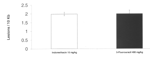 Figure 6: Mitochondrial DNA damage in rat intestinal tissue after administration of single doses of indomethacin and 5-fluorouracil. (N=5, Mean+/- SEM).