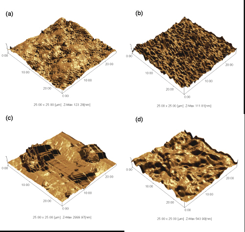 Figure 1: SPM images of MA (a), Surelease (b), and Aquacoat films plasticized with DEP (c) and DBP (d).