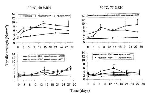 Mechanical properties of a film are critical as they affect the intended function of the film in a dosage form. These properties were found to vary to different extents with time when the plasticized EC films were stored at 30°C, 50 %RH for over 4 weeks. (Figures 2-5).