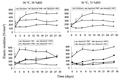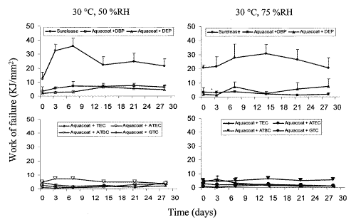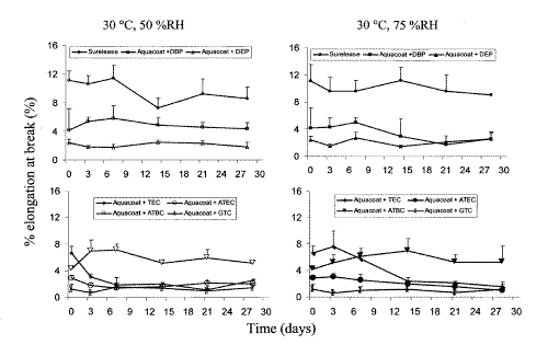 Changes in mechanical properties of Aquacoat films plasticized with TEC and ATEC also indicated a hardening of film resulting in increased brittleness. The determination of TEC content by gas chromatography in Aquacoat films showed a loss of approximately 25% after a week of storage at 50 %RH. However, no further loss in TEC content was observed on prolonged storage. By contrast the elastic modulus and % elongation at break values continued to show changes beyond a week of storage. Table 4 shows a significant (p<0.05) correlation between TEC content and % elongation at break or elastic modulus of films. This suggests that the initial changes of Aquacoat films were due to TEC loss. After prolonged storage, other factors had contributed to the continual hardening of the films.
