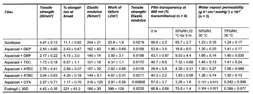 The mechanism for film formation of latex systems has been proposed by many researchers (23, 24, 25). Each submicron-size polymer consists of hundreds of polymer chains. The film formation involves coalescence of these polymer particles into a homogeneous continuous film as the aqueous phase evaporates. As water evaporates, interfacial tension between water vapour and polymer pushes the particles into close packing as ordered arrays. A strong driving force, exerted mainly by capillary action between particles, is necessary to overcome repulsive forces, deform the particles and cause them to fuse. The film forming process depends on the manufacturing method, coating conditions and formulation variables. It was also reported that the degree of coalescence of latex particles increased with storage time (26). In most of the studies, the degree of coalescence was found to be greatly affected by storage temperature (1, 26, 27). It was likely that the changes in mechanical properties and loss of weight of Aquacoat films plasticized with TEC and ATEC on prolonged storage was mainly due to the phenomenon of coalescence. On the other hand, changes in mechanical properties of Aquacoat films plasticized with DEP and GTA were probably influenced by two factors, loss of plasticizers and increasing coalescence of polymer particles during storage. This explained the greater magnitude of change in tensile strength and elastic modulus, as well as percent weight change observed for Aquacoat films plasticized with DEP and GTA.