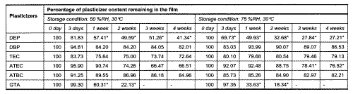 Assays of DEP, DBP, GTA, TEC, ATEC and ATBC remaining in Aquacoat films at different time intervals were carried out. The amounts of DEP and GTA were found to decrease significantly after a week of storage at 50 %RH (Table 2).