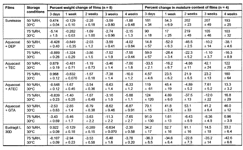 Many polymeric film coats applied onto a dosage form have been reported to undergo changes in mechanical properties upon storage. The extent of these changes is influenced by several factors such as the amount of plasticizers added, type of plasticizers used, film forming conditions, film storage temperature and humidity. It was found that films formed from aqueous ethylcellulose dispersions showed significant changes in their mechanical properties when they were dried at a higher temperature (1). Exposure to a high relative humidity may cause a polymeric film coat to absorb moisture from the atmosphere. Findings of several researchers suggested that changes in mechanical properties of some polymeric films stored at high humidities are correlated with the plasticizing properties of the moisture present in films. Changes in the mechanical properties of unplasticized hydroxypropylmethylcellulose films exposed to high humidity were found to be consistent with the plasticizing effect of water (2). In another study, it was reported that higher storage relative humidity resulted in a decrease in both tensile strength and Young's modulus of beads coated with Eudragit RS 30D/RL 30D containing methylparaben as a non-traditional plasticizer (3). Changes in film mechanical properties may ultimately influence the drug release, stability and the final physicochemical properties of the coated dosage forms (4).