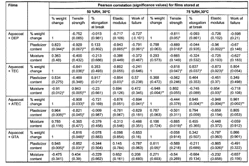 Table 4: Pearson correlation for films exposed to storage conditions of 50 %RH, 30°C and 75 %RH, 30°C.