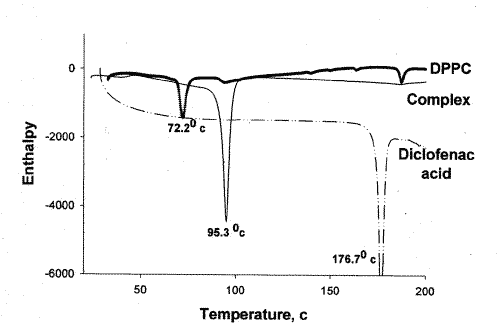 Thermograms of diclofenac acid, diclofenac sodium and the diclofenac-DPPC complex were recorded using a Seiko SSC/5200 differential scanning calorimeter (Plymouth Meeting, Pennsylvania, USA). The thermal behavior was studied by heating 2.0±0.2 mg of each individual sample in a covered sample pan under nitrogen gas flow. The investigations were carried out over the temperature range 25-200° with a heating rate of 10°/min.