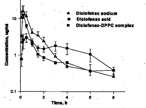 Male Sprague-Dawley rats (n=5/group) were anesthetized with methoxyflurane. A PE-10 tubing fitted into a PE-50 catheter was implanted into the right jugular vein for the collection of blood samples. Rats received, via a gastric gavage, single oral doses of diclofenac sodium, diclofenac acid suspension in 1% methylcellulose or diclofenac -DPPC complex suspension in water (equivalent to 15 mg/kg of diclofenac sodium). They were fasted overnight and during the experiment but had free access to water. Blood samples (0.2 ml) were taken at 0, 0.08, 0.17, 0.25, 0.5, 1, 1.5, 2, 3, 4, 6, and 8 h post-dose, plasma was separated, and stored at -20° until analysis.