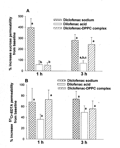 Similar to diclofenac acid, the DPPC complex exhibited limited increased sucrose permeability within the first h post-dose. This, however, cannot be attributed to less drug release from the complex, as the drug absorption from the complex is rapid and comparable with that of the sodium salt (Figure 2). The presence of the complex, therefore, might have provided a degree of mucosal protection. The protective effect, however, appears to be limited to the upper GI tract and only during the first h post-dose (Figure 3). The complex yielded increased permeability comparable to that of diclofenac sodium for sucrose 3 h post-dose and for 51Cr-EDTA at both examined times (Figure 3).