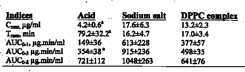 Table 1: Bioavalability indices of diclofenac acid, diclofenac sodium and diclofenac-DPPC complex following oral administration of 15 mg/kg (diclofenac sodium equivalent) to rats.