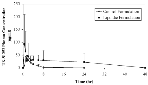 The control formulation was prepared by using lactose (Spectrum, Gardena, CA) as the filler. Preweighed amounts of Compound UK 81252 (100 mg) and lactose (1900 mg) were triturated and mixed using a mortar and pestle. Appropriate amount (200 mg) of this powder blend was encapsulated in size 00 Swedish orange hard gelatin capsules (Capsugel, Greenwood, SC) by hand filling. The filled capsules were then sealed with a hydroalcoholic solution of gelatin. For lipoidic formulation, caprylocaproyl macrogolglycerides (Labrasol, Gattefosse, and Westwood, NJ) was used as the vehicle. Compound UK 81252 (120 mg) was homogeneously dispersed in polyglycolyzed glycerides (8280 mg) using a mortar and pestle. Appropriate amount (700 mg) of this dispersion was encapsulated in size 00 Swedish orange hard gelatin capsules by hand filling.