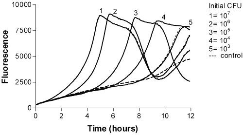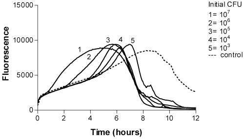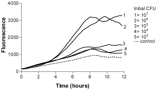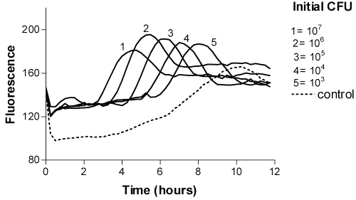 Bacterial growth studies using resazurin as a fluorogenic substrate. The bacteria used was P. aeruginosa (ATCC - 2 15442). Bacteria were harvested from blood-agar plates, inoculated into ISB-broth and allowed to grow overnight at 37°C. A ten fold dilution series was prepared in the 0.9% NaCl. The initial bacterial numbers in the wells of the microtitration trays corresponded to 103 -107 CFU/ml. A stock solution of resazurin (0.05 mg/ml) was prepared by dissolving resazurin in sterile water. The final concentration of resazurin in sample mixtures was 0.006 mg/ml. The bacterial suspension (50 m l, initial concentration 107 CFU/ml in wells, 8 replicates) was dispensed into microtitration tray wells containing 50 m l dry milk, 20 m l resazurin and 230 ml ISB. P. aeruginosa were allowed to grow for one day. The fluorogenic resazurin reaction for bacterial activities was monitored 12 hour at 37°C (excitation 544 nm and emission 584 nm).