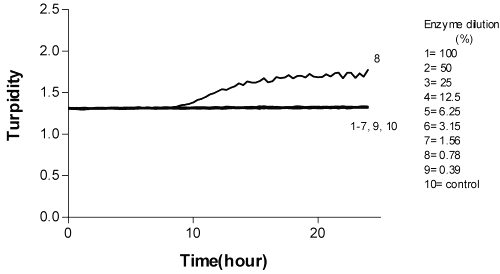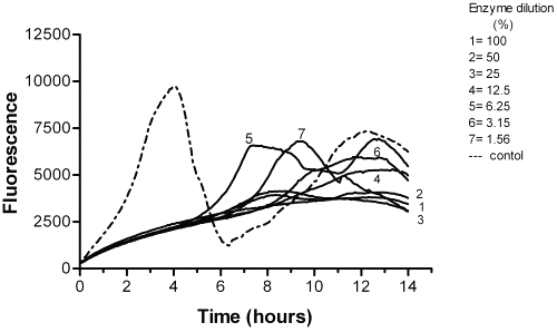 Washing procedure and tests on cleaning agents. After incubation of P. aeruginosa , the wells were rinsed twice with sterile water and then washed once with ELISA washer before enzyme treatment. A dilution series of enzymes (100%-1.5% enzyme product) was prepared in sterile water. The enzyme dilutions were added to wells of a microtitration tray (200 m l to each well, 8 repeats). The tray containing the enzyme dilutions was incubated 30 min and 15 min at optimal conditions for each enzyme (pH and temperature). After incubation, the enzyme product was removed from the wells and washed three times with sterile water. Medium and the flurogenic substrate were added to each well before the measurement. With proteinase samples, two different concentrations were used in final assay system. Sample dilutions were buffered at pH 8 and temperature used was 5°C. Duration of incubation was 2 h and 24 h.