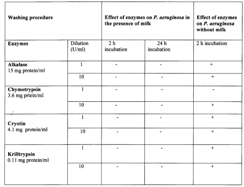 When proteinase agents were considered, a significant effect against Pseudomonas biofilm was seen when milk was not included in the suspension. However, the proteinase agents had no effect on biofilm in the present of milk (Table 2).
