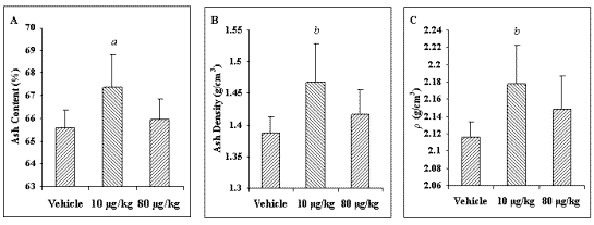 To assess changes elicited by weekly PTH (1-34) administration on the bone mineral content, segments of the proximal tibia were ashed. Weekly treatment of 10 mg/kg PTH (1-34) resulted in significant increases in both ash content (2.7%) and ash density (5.8%) compared to the vehicle-treated group (Figure 1).