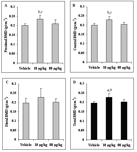 Figure 2: The effects of weekly PTH (1-34) administration on bone mineral density within the proximal (A), central (B), and distal (C) regions as well as the total (D) femur. In all of the selected regions, except distal, a significant increase in the 10 mg/kg-treated group was observed over that of the vehicle- and 80 mg/kg-treated groups. ap<0.05 vs. 80 mg/kg-treated group. bp<0.025 vs. vehicle-treated group. cp<0.025 vs. 80 mg/kg -treated group.
