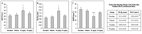 Figure 3: The effect of weekly PTH (1-34) administration on structural parameters BV/TV (A), BS/TV (B) and Tb.Th. (C), of the trabecular bone within the femoral neck. Listed in the table is a summary of all of the architectural parameters generated for this region. ap<0.05 vs. 80 mg/kg-treated group. bp<0.0125 vs. vehicle and 80 mg/kg-treated groups and. cp<0.0125 vs. all other groups.