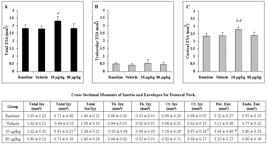 Figure 4: The effect of weekly PTH (1-34) administration on total (A), trabecular (B) and cortical (C) XSA within the femoral neck. Summarized in the table are the second moments of area about the horizontal and vertical axes (Iyy and Ixx, respectively) for total, trabecular (Tb.) and cortical (Ct.) XSA as well as the areas of the periosteal and endosteal envelopes (Endo.Env. and Per.Env., respectively). ap<0.05 vs. vehicle-treated group. bp<0.05 vs. 80 mg/kg-treated group. cp<0.025 vs. vehicle-treated group. dp<0.0125 vs. baseline and vehicle-treated groups. e p<0.0125 vs. all other groups.