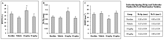 Figure 5: The effect of weekly PTH (1-34) administration on the structural parameters BV/TV (A), BS/TV (B), and Tb.Th. (C), of trabecular bone within the third lumbar vertebra. The table summarizes all of the architectural parameters generated of the trabecular bone from the L3. ap<0.0125 vs. vehicle and 80 mg/kg-treated groups. bp<0.0125 vs. all other groups.