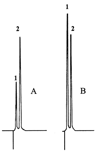 Figure 1: Chromatograms of sulfadiazine solutions partially degraded (A) and not degraded (B). Peak 1: Sulfadiazine (retention time = 0.8 min), peak 2: internal standard (retention time = 2.4 min).