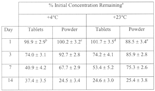 Table 1: Stability of SDZ 200 mg/mL oral liquids prepared from tablets and powder at two temperatures.