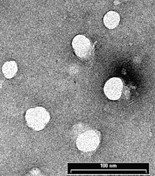 Average size of the particles was determined by measuring the size of around 200 particles. From TEM, average particle size was found to be 44.0 nm with a polydispersity index of 2.76 nm, which is in agreement with the size obtained from DLS measurements. The TEM picture showed that the particles were spherical in shape.