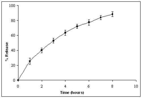 In order to study the stability of FITC-Dex loaded pullulan nanoparticles (crosslinked with glutaraldehyde) from the aqueous dispersion system, the release of drug from nanoparticles was measured in the phosphate buffered saline (PBS). Results from figure-3 showed that the release of drug from nanoparticles increased with time with 75% of FITC-Dex released in 6 hours, while only 40% of the drug was released in initial 2 hours.
