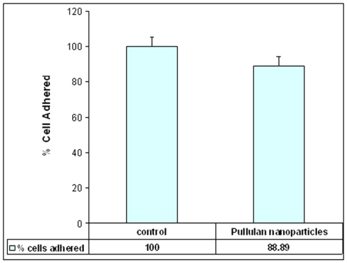 It was observed from cell adhesion experiments that pullulan nanoparticles did not affect the adhesion of cells as compared to control. Moreover, the MTT assay also supported these results. Taken together, the results from the MTT assay and cell adhesion suggest that the pullulan nanoparticles are non-toxic to cells and do not cause any apparent harm to cells. The cells were healthy and maintained their morphology and adhesion capacity. It is known that cell adhesion is mediated by the interaction of surface proteins such as integrins with proteins in the extracellular matrix or on the surface of other cells or particles (28-29). The phenomenon of cell adhesion is of crucial importance in governing a range of cellular functions including cell growth, migration, differentiation, survival, and tissue organisation (30). Thus, the carrier system should not elicit a generic and chronic inflammatory response that can ultimately result in failure to achieve normal cell growth and function at the cell-particle surface.