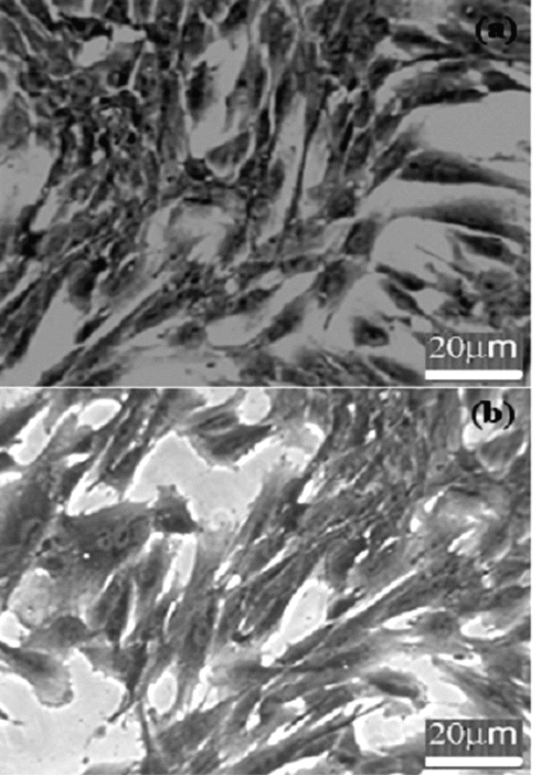Figure 6: Coomassie blue stained cells (a) control and (b) incubated with pullulan nanoparticles; (n=3). The figure shows that the cells are well spread and there is no distinct change in morphology after 24-hour incubation with pullulan nanoparticles relative to control cells.