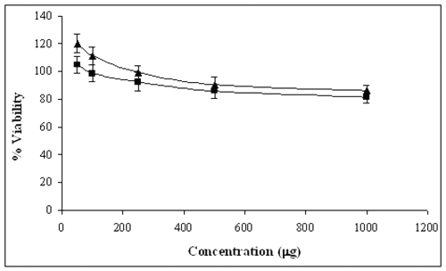 In vitro cell viability/cytotoxicity studies: The MTT (3-(4,5-dimethylthiazol-2-yl)-2,5-diphenyltetrazolium bromide) assay is a simple non-radioactive colorimetric assay to measure cell cytotoxicity, proliferation or viability. MTT is a yellow, water-soluble, tetrazolium salt. Metabolically active cells are able to convert this dye into a water-insoluble dark blue formazan by reductive cleavage of the tetrazolium ring (25). Formazan crystals, then, can be dissolved and quantified by measuring the absorbance of the solution at 550 nm, and the resultant value is related to the number of living cells. The cytotoxicity of the nanoparticles was determined after 24 and 48 hours incubation with fibroblasts. To determine cell cytotoxicity/viability, the cells were plated at a density of 1x 104 cells/well in 96 well plate at 37°C in 5% CO2 atmosphere. After 24 and 48 hours of culture, the medium in the wells was replaced with the fresh medium containing nanoparticles of varying concentrations. After 24 hours (or 48 hours), 20μl of MTT dye solution (5mg/ml in phosphate buffer pH-7.4) was added to each well. After 4 hours of incubation at 37°C and 5% CO2 for exponentially growing cells and 15 min for steady-state confluent cells, the medium was removed and formazan crystals were solubilized with 200 ml of DMSO and the solution was vigorously mixed to dissolve the reacted dye. The absorbance of each well was read on a microplate reader (DYNATECH MR7000 instruments) at 550 nm. The spectrophotometer was calibrated to zero absorbance using culture medium without cells. The relative cell viability (%) related to control wells containing cell culture medium without nanoparticles was calculated by [A]test / [A] control x 100. Where [A]test is the absorbance of the test sample and [A]control is the absorbance of control sample.