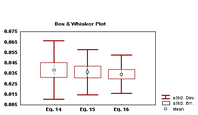 Figure 7: Box and whisker plot of the standard deviation, the standard error and the mean of the errors in equations 14, 15 and 16.
