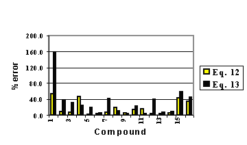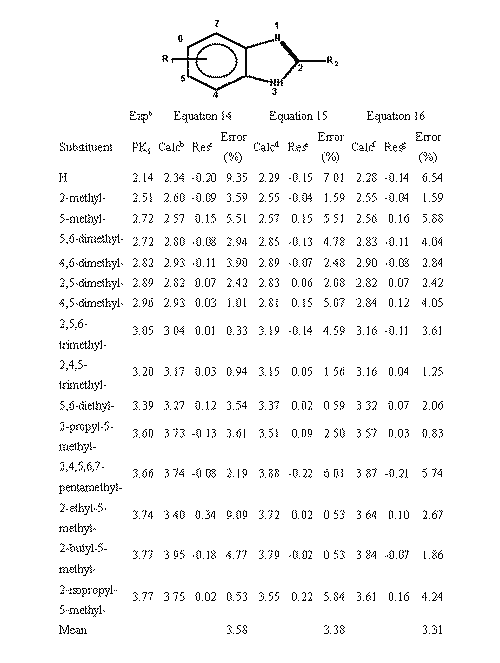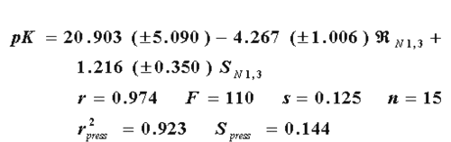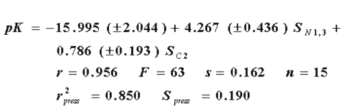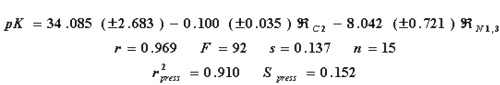 where r, s and F represent the correlation coefficient, standard deviation of regression, and Fisher ratio, respectively. The high value of the cross-validation regression coefficient ( r2press ), and the similarity of "s" and Spress , tells us about the high stability of the model. The variable ÂC2 is the R-state of the atom numbered as 2, and ÂN1, 3 is the average of the R-state values of the nitrogen atoms numbered 1 and 3. The best model previously reported is the one obtained by Hall (4), which includes the E-state values of the atom 2, and the average E-state values of the nitrogens 1 and 3 (eq. 15).