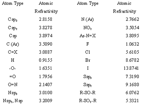 where the sum is all over j adjacent vertices in the graph, ARi and ARj are the intrinsic refractivity values of the atoms i and j respectively, and rij2 is the number of atoms in the shortest path between atoms i and j including both i and j that's to say, the distance between atoms counted as the graph distance ( dij ) plus one (2-4). As in the E-state, this quadratic topological distance, indicates that there must be a decrease in the interaction effect with the separation distance between atoms. Atomic refractivity values (7) used in the analysis is shown in table 1. The intrinsic values of the refractivity for each one of the heavy atoms include the atomic refractivity value of the hydrogen atoms bonded to them.