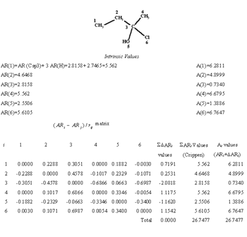 Note that the sum of the R-state index of all the atoms (Ai ) in the molecule is equal to the sum of the intrinsic atomic contribution values (S ARi), but the value itself is rather dissimilar. Using this approach the methyl groups 1 and 4 are marked as non equal as expected since their environments are different and the dispersive forces in the methyl group 4 should be higher because of the number and nature of the groups present in that part of the molecule. It is also relevant the decrease of the value on the atom number 3, which is buried in the skeleton and hence unable to have a direct interaction with a hypothetical active site or molecule from a dispersive-sterical point of view.