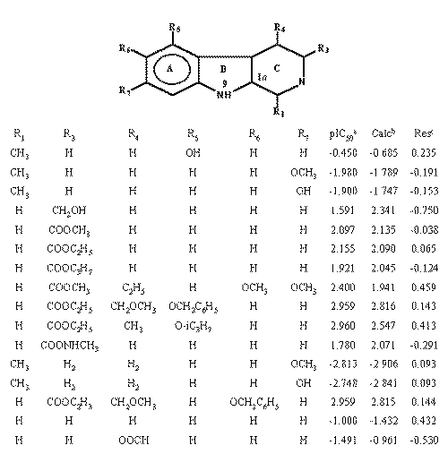 To test the capability of the index to describe interactions in active sites, the receptor binding of a series of b -carbolines was investigated (12). The affinities were determined by the drug displacement of 50% of 3H-flunitrazepam from synaptosomal rat membranes (pIC50 ) and are given in Table 3.