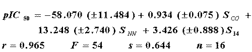 a Experimental value for the inhibition constant. bValues computed for inhibition from eq. 14 cres=pKi-calc. dValues computed for inhibition from eq. 15 eres=pKi-calc. fValues computed for inhibition from eq. 16 gres=pKiexp- pKicalc.The regression equation and statistical parameters for the correlation biological property-R-state values are shown (Eq. 14).