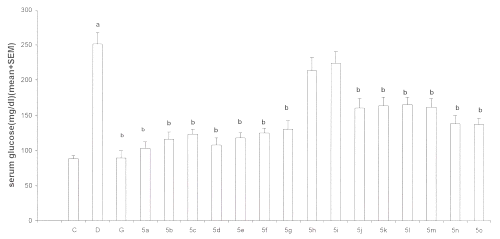 Figure 1: Effect of test compounds 5a-5o on serum glucose in alloxan-induced diabetes in rats (n=6-8). C= normal controls D= diabetic controls G= gliclazide treated 5x= test compound treated a=p<0.05 when compared with C and b p<0.05 when compared with D.