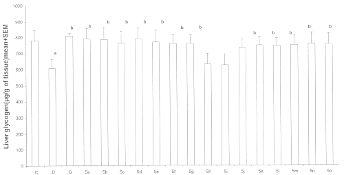 Figure 2: Effect of test compounds 5a-5o on hepatic glycogen content in alloxan-induced diabetes in rats (n=6-8). C= normal controls D= diabetic controls G= gliclazide treated 5x= test compound treated a=p<0.05 when compared with C and b p<0.05 when compared with D.