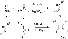 Imines were prepared by condensation of primary amine with equivalent aldehyde proportion in dichloromethane in the presence of anhydrous magnesium sulphate, were treated with ketenes, generated in-situ from acid chlorides in the presence of triethylamine to give desired azetidin-2-ones2 (Scheme-1). Stereochemistry of the synthesized compounds 5a-o (Table I) was assigned based on the reported coupling constant for methine H-3/H-4 protons. ( J = 2-4 Hz and 4-6 Hz for trans-azetidinones and cis-azetidinones respectively)3.