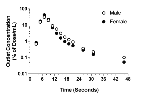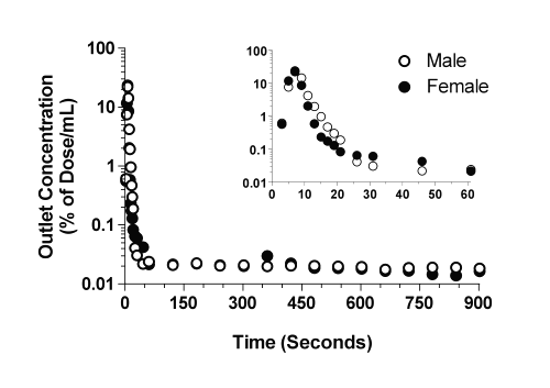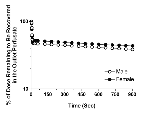 Figure 3: The concentration-time profiles of the marker FD-70 in the outlet perfusates of representative male and female livers after administration of a bolus 1-mg dose of the marker.