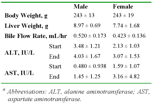 Table 1: The average ± SD values of body and liver weights, bile flow rates, and enzyme levels in male and female rats (n = 6 and 7, respectively).a