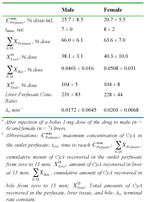 In conclusion, our study shows that the tissue binding of cyclosporine A is substantial, slowly reversible, and gender-independent in isolated perfused rat livers. More sophisticated designs allowing multiple measurements of the drug and its metabolites in liver tissue, bile, and perfusate are needed to accurately characterize the kinetics of binding, metabolism, and biliary excretion of CyA in the liver.
