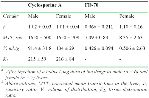 Table 3: The average ± SD values of kinetic parameters of cyclosporine A and FD-70 in isolated perfused rat livers derived from moment analysis of data.a,b