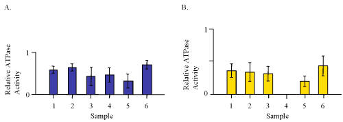 Figure 1: ATPase activity for aliquots of 100 mg/ml extracts from capsules containing valerian root expressed as a ratio to 20 mM verapamil from each individual assay. A. Water extracts. B. 70% ethanolic extracts.