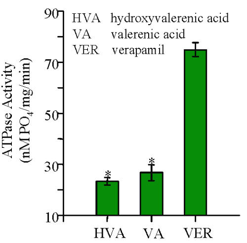 Figure 2: The vanadate-sensitive P-glycoprotein ATPase activity for 20 μM valerenic acid, hydroxyvalerenic acid and verapamil (n=2).