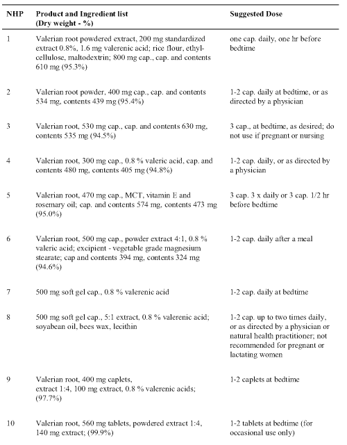There were marked differences in the information provided by the manufacturers on the product label, making it difficult to compare relative amounts in each product. Daily dose of the tablets, capsules and caplets ranged from 1 to 9 units. Less than half of the product labels stated that the products were standardized to 0.8%. Of these 3 were listed to contain valerenic acid (VA), 2 samples (NHP 4 and 6) reported standardization to valeric acid which is not the industry standard, and 1 mentioned valerenic acids (VAs). The moisture content determined for the capsules, tablets and caplets ranged from 0.1 to 5.5%. The actual NHP 6 product weight content of 324 mg or 394 mg for capsule and content (Table 1) was considerably lower than the 500 mg stated on the product label; three products (NHP 1, 2, and 4) had higher weights but only NHP 1 indicated the presence of excipients. The excipients in these 3 products ranged from 39 to 610 mg accounting for about 10 to 75% of the content weight.