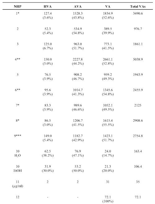 Information printed on some product labels examined in this study stated that the products were standardized to VA, VAs and valeric acid. This is indicative of the confusion created by the industry, as valeric acid is a 5 carbon molecule, which is not related to the much larger VA acids. HPLC analysis of the related VAs revealed all products contained this valerian marker but there was wide variation in content compared to the concentrations stated on the label of some product. With the exception of one tea (NHP 14), the lowest VAs recovery was with tablet, tincture and tea products examined. The highest recovery was observed in the powder capsules. In most samples (NHP 1-9), similar amounts of AVA and VA were present with lesser amounts of HVA. Interestingly two products, the tablet NHP 10 and tea NHP 13 had markedly higher amounts of HVA. The total content of VAs varied from 977 to 5039 ppm and supports the reports of substantial product heterogeneity (29, 30) who found that the concentration of VA and its derivatives ranged from < 0.01 to 6.32 mg/g of product.