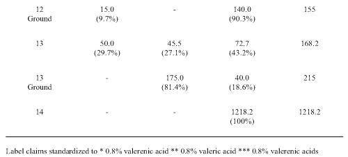 Each product was analyzed to determine content of hydroxyvalerenic acid (HVA), acetoxyvalerenic acid (AVA) and VA (Table 2).